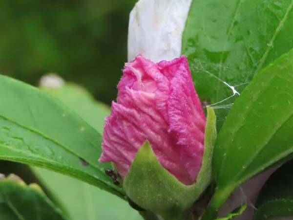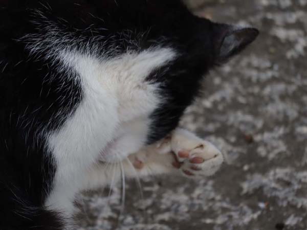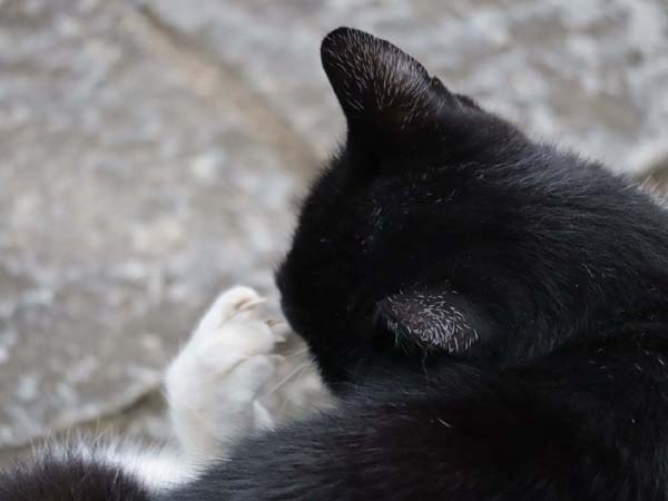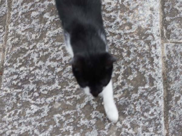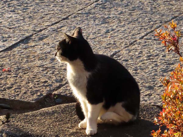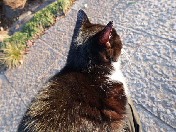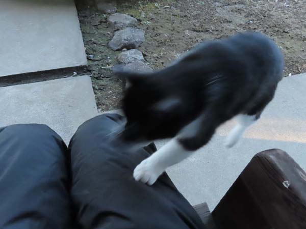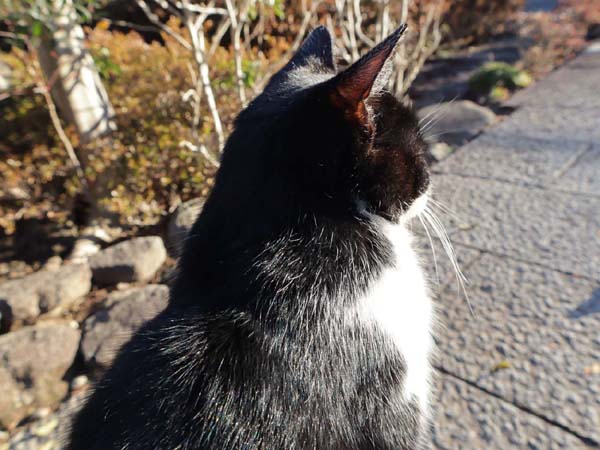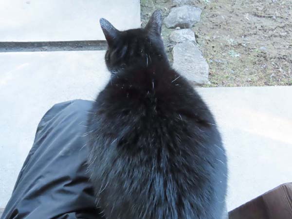 「梅にゃんのお戯れですにゃ。梅にゃんが毎朝庭掃除してる時に何時も傍で見守っていますにゃ。でも、すぐ近づいてきて猫気てるにゃ、ちょっと微妙にゃ」